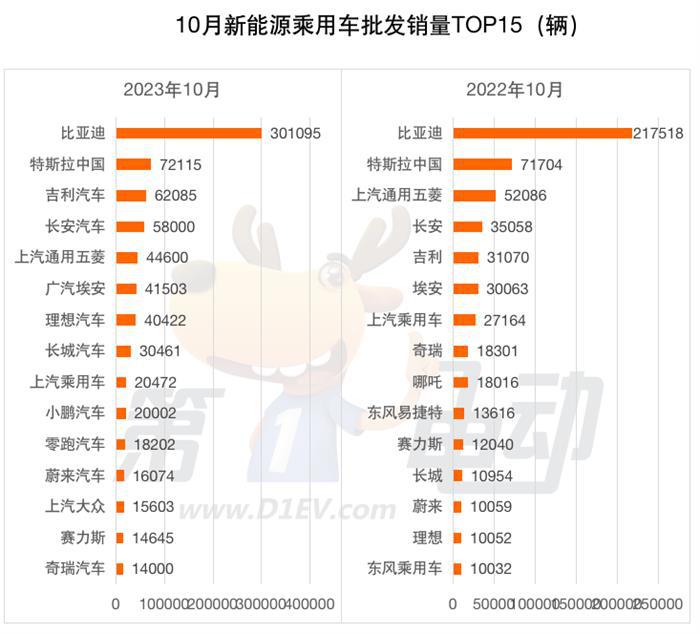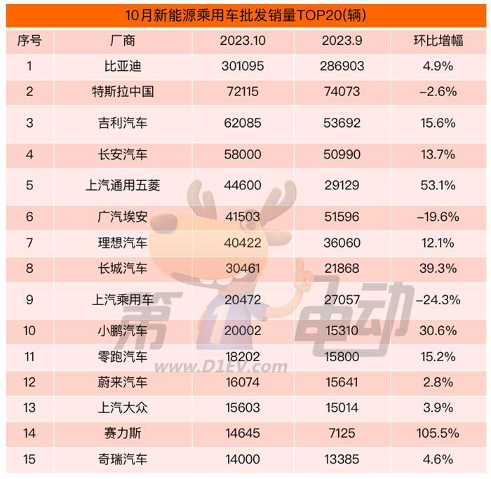 10月车企批发销量榜:比亚迪突破30万辆势不可挡 赛力斯重生