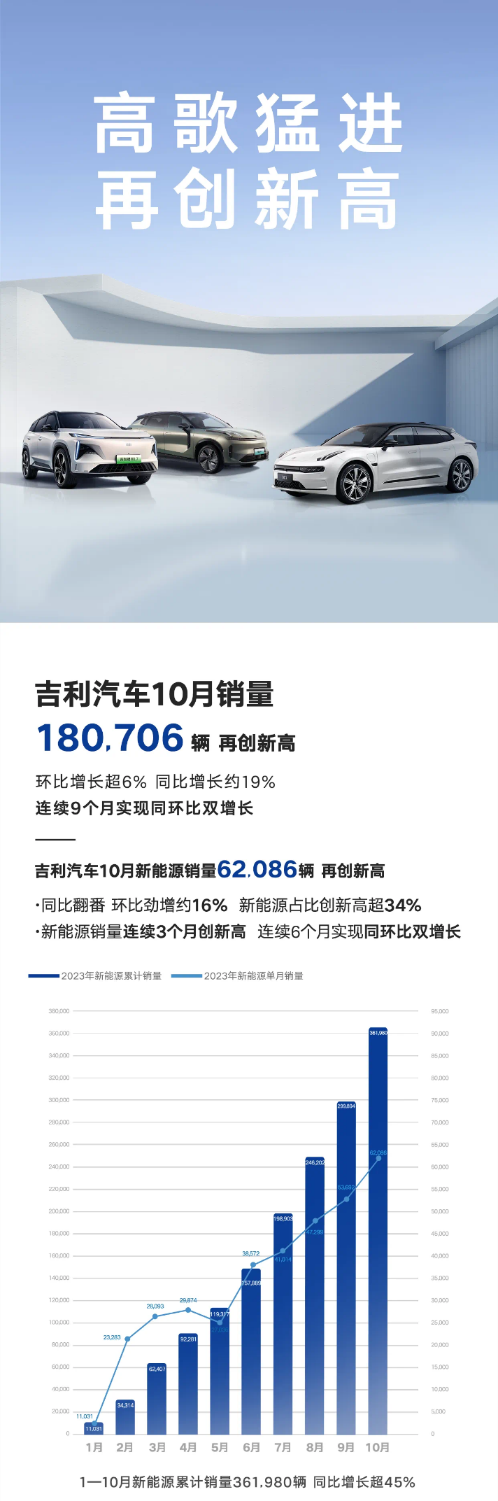 吉利方面,新能源销量为62086辆,首次突破6万大关。吉利银河系列10月销量13711辆,银河L7 上市5个月累计销量突破5万辆。