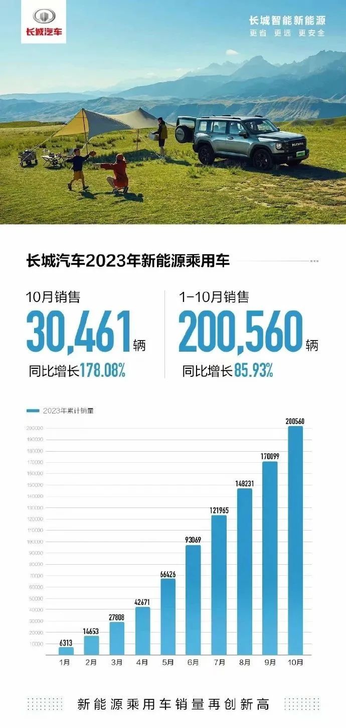 长城方面,10月新能源汽车销量30461辆,首次突破3万,同比增长178.08%。长城1-10月新能源汽车销量200560辆,同比增长85.93%。可以发现,经过合并调整的长城汽车,在新能源业务方面已经逐步显现实力。