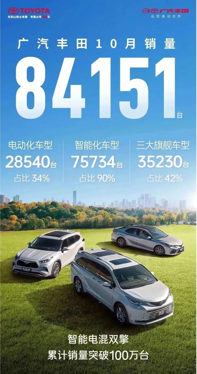 除此之外,广汽丰田新能源板块也在持续向好。广汽丰田日前公布了 10 月汽车销量情况显示,新能源车型 28540 辆,占比 34%。而广汽本田方面,并没有公布10月份的交付成绩,仅仅公布了雅阁、型格、皓影三车10月共交付46,983辆。
