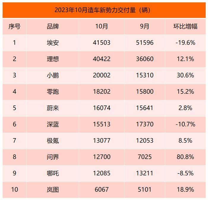 10月新势力榜:理想首次突破4万辆 小鹏重回前三