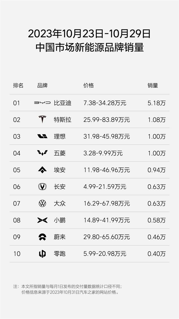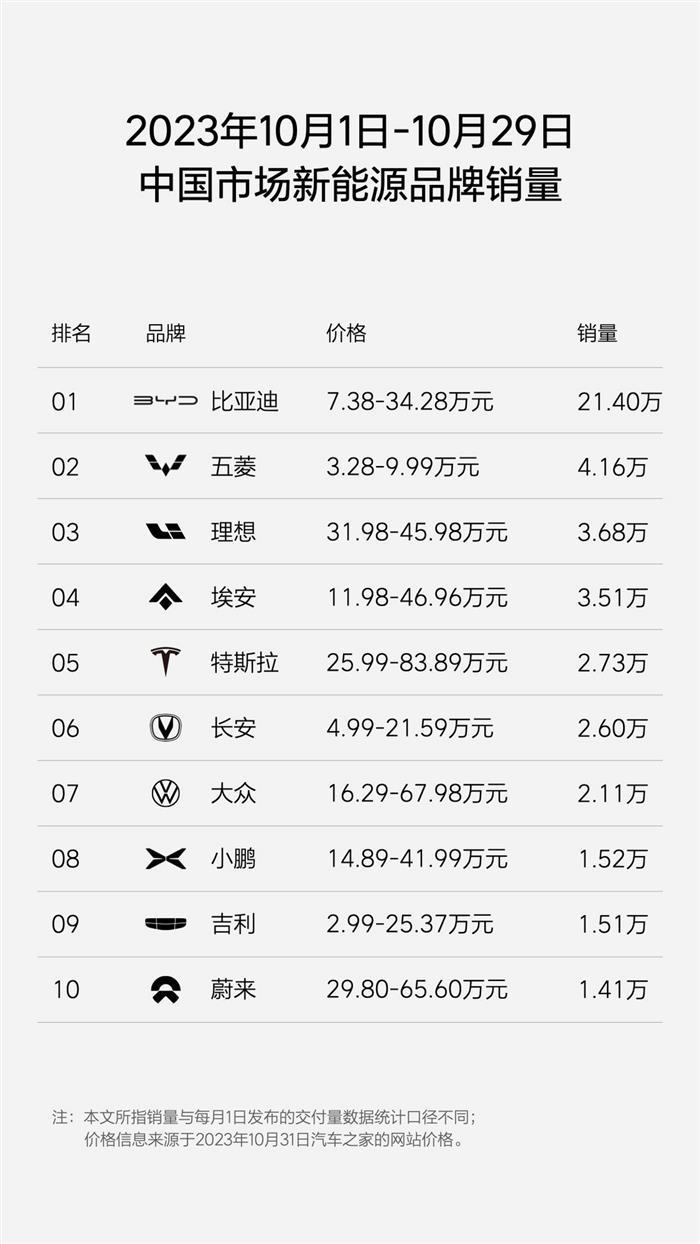 从排行榜上还可以看到,小鹏汽车和蔚来汽车以0.58万和0.46万紧随其后;而零跑、深蓝、哪吒三个品牌作为新生代的新势力,在销量上同样获得了不错的成绩,其销量分别是0.4万、0.32万和0.25万;最近“遥遥领先”的问界的销量也在逐步攀升,达到了0.39万,虽然排名仅第5,但凭借其手中的订单,其销量一定会越来越好。