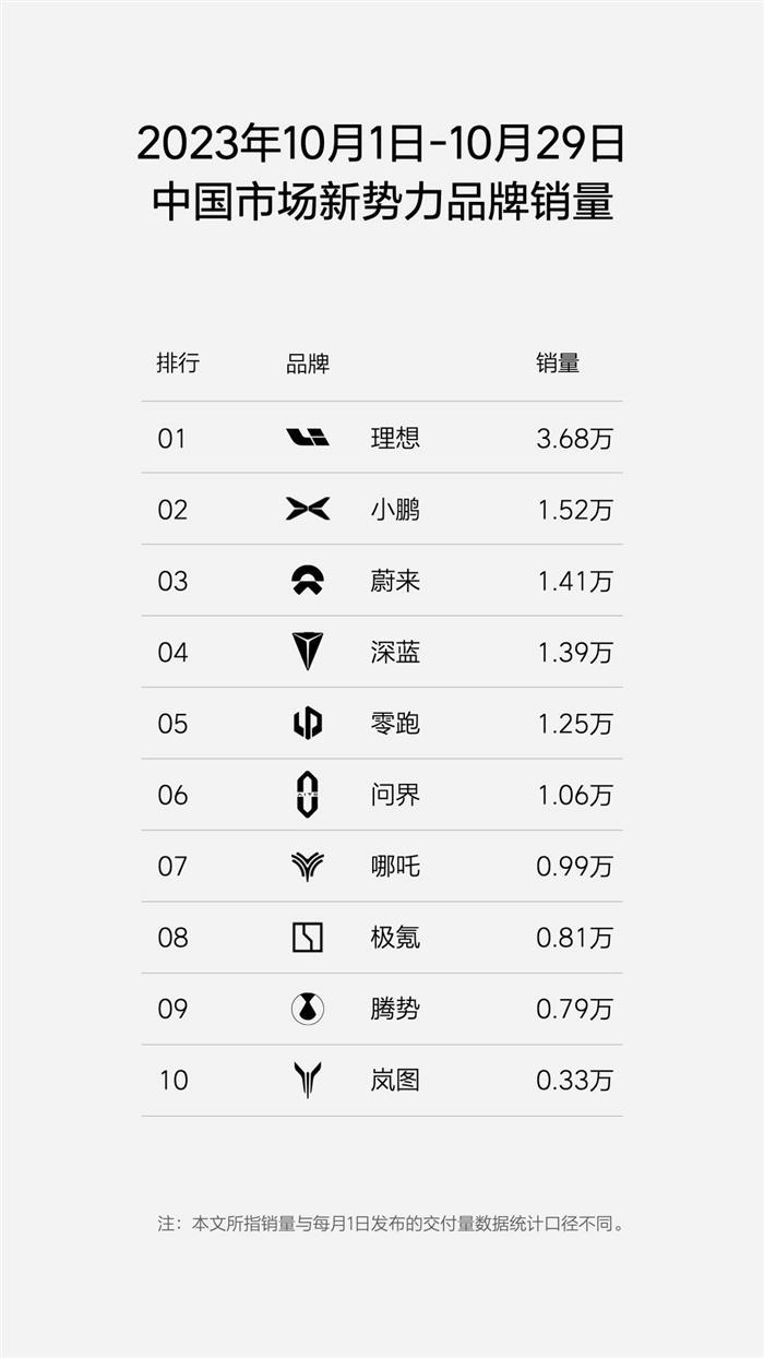10月31日消息,理想汽车发布上周(10.23-10.29)销量榜,理想汽车的周销量达1万辆,持续领跑新势力。截至10月29日,理想汽车本月销量已达3.68万辆,即将达成月销4万辆目标。同一时间,理想汽车 CEO李想就公布了下一阶段目标,“三款车月交付4万/月完成后,继续挑战下一个更高的难度:整体5万/月,以及理想L7的2万/月。 ”