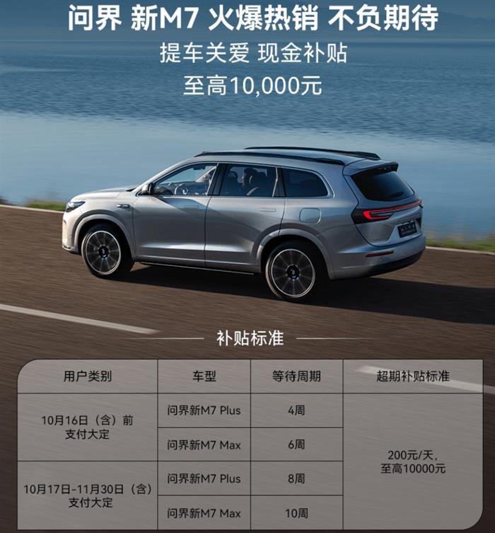 根据问界官方发布的一则补贴标准来看,目前预定新M7,消费者需要等待4-10周才能提车。换句话说,消费者至少要等待1个月以上才能提到车。这也说明问界M7的产能确实跟不上。
