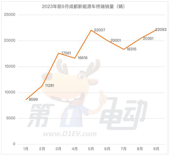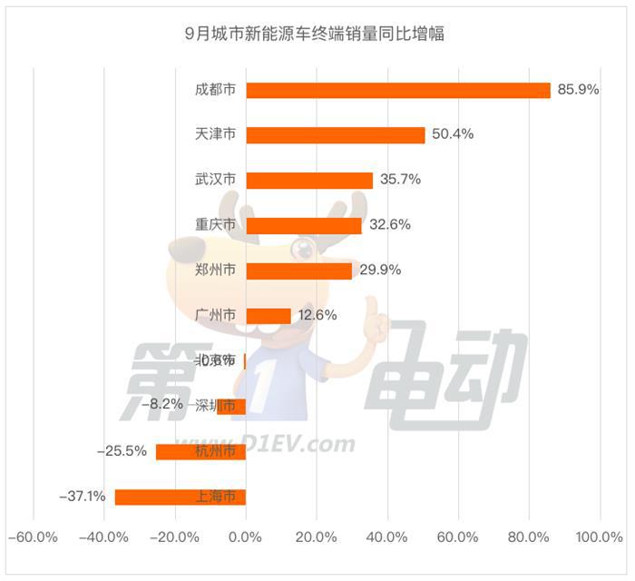 而成都、天津、武汉、重庆、郑州、广州均同比实现上涨,其中成都大涨85.9%,9月更是创历史新高终端销量达22,093辆,主要得益于理想、蔚来、小鹏、腾势、零跑、埃安等品牌销量的暴涨。