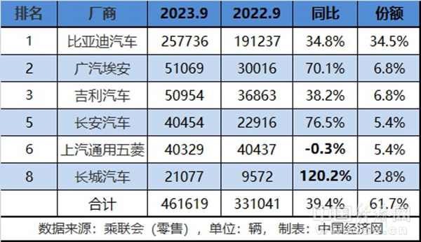 从乘联会发布的新能源汽车厂商零售销量TOP10排行榜来看,传统品牌依然延续前两月竞争格局,9月及前9月6家上榜企业及排名未发生改变。9月,传统品牌新能源合计销量46.2万辆,同比增长39.4%;1-9月,传统新能源合计销售321.7万辆,同比增长54.6%。9月及前9月,传统新能源市场份额均超过61%。