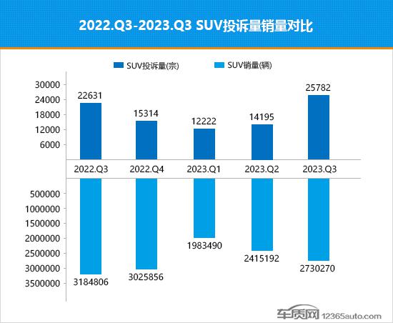 据国内领先的缺陷汽车产品信息收集平台车质网数据显示,2023年三季度共受理国内SUV投诉量累计为25,782宗,乘联会数据显示同期国内SUV(除进口车)销量约为273万辆。除进口车型外,三季度有销量数据支撑的SUV共有322款,为确保数据的准确性,车质网本次只统计这322款车型的首次投诉案例,计算得出2023年三季度SUV投诉销量比均值为万分之63.2,较二季度万分之38.4的均值有大幅提升,投诉销量比表现加速转差。