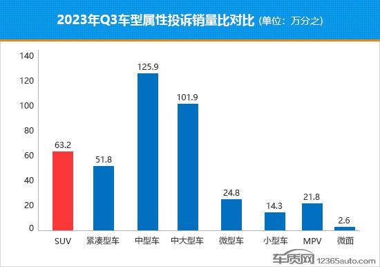 从各车型三季度投诉销量比数值来看,SUV的投诉销量比数值环比增长幅度仅次于中型车,排名由二季度的第五名上升至第三名,投诉销量比表现下滑明显。