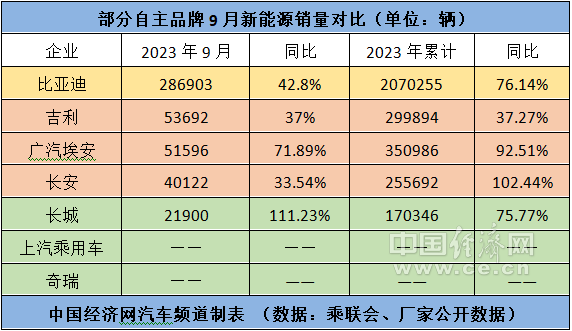 数据显示:9月,比亚迪乘用车、吉利、长安乘用车、奇瑞、长城、上汽乘用车、广汽自主和东风自主的销量分别为286903辆、170472辆、143585辆、136041辆、121632辆、92340辆、88882辆、27662辆,同比分别增长42.8%、31%、14.38%、20.4%、29.89%、23.37%、39.95、-23.3%;今年前三季度的累计销量分别为2070255辆、1155278辆、1178620辆、909374辆、864045辆、650512辆、646940辆、198188辆,同比分别增长75.39%、17%、23.87%、33.8%、7.69%、6.44%、43.86%、-27.38%。