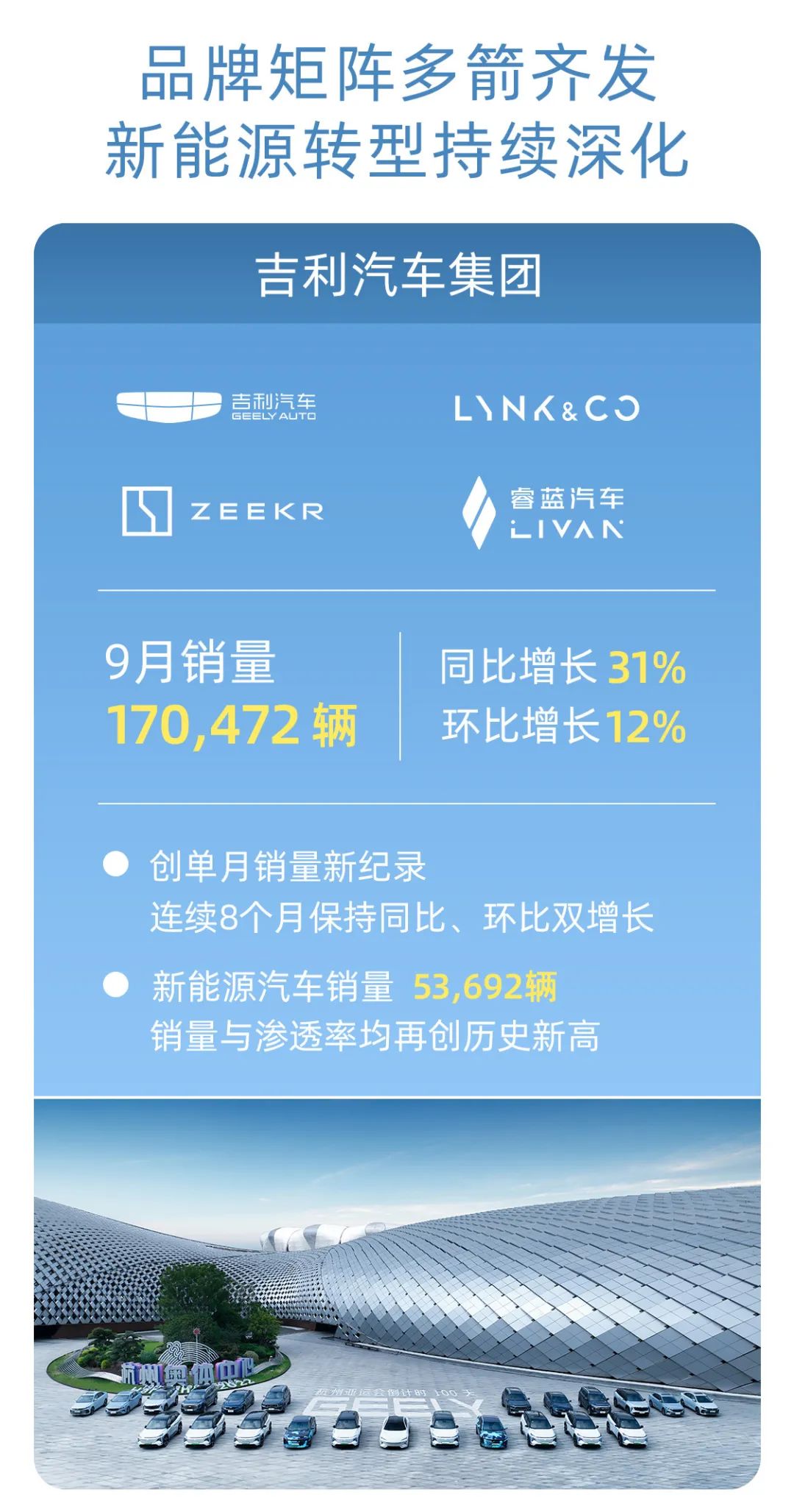 10月16日,吉利控股集团微信公众号公布,9月总销量达26.44万辆,同比增长26%;新能源汽车销量9.37万辆,同比增长38%,新能源渗透率达35%。吉利控股正以电动化、智能化为核心,加速科技转型、生态协同。