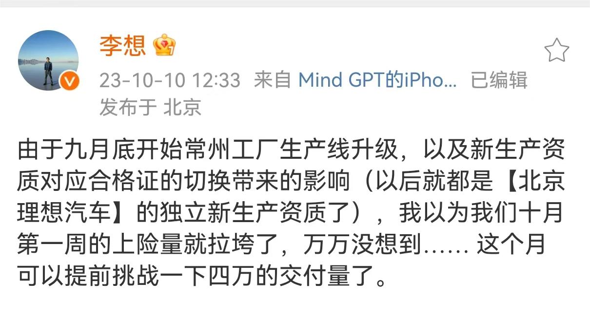 对此,李想在微博发文表示:“由于九月底开始常州工厂生产线升级,以及新生产资质对应合格证的切换带来的影响(以后就都是【北京理想汽车】的独立新生产资质了),我以为我们十月第一周的上险量就拉垮了,万万没想到…… 这个月可以提前挑战一下四万的交付量了。”