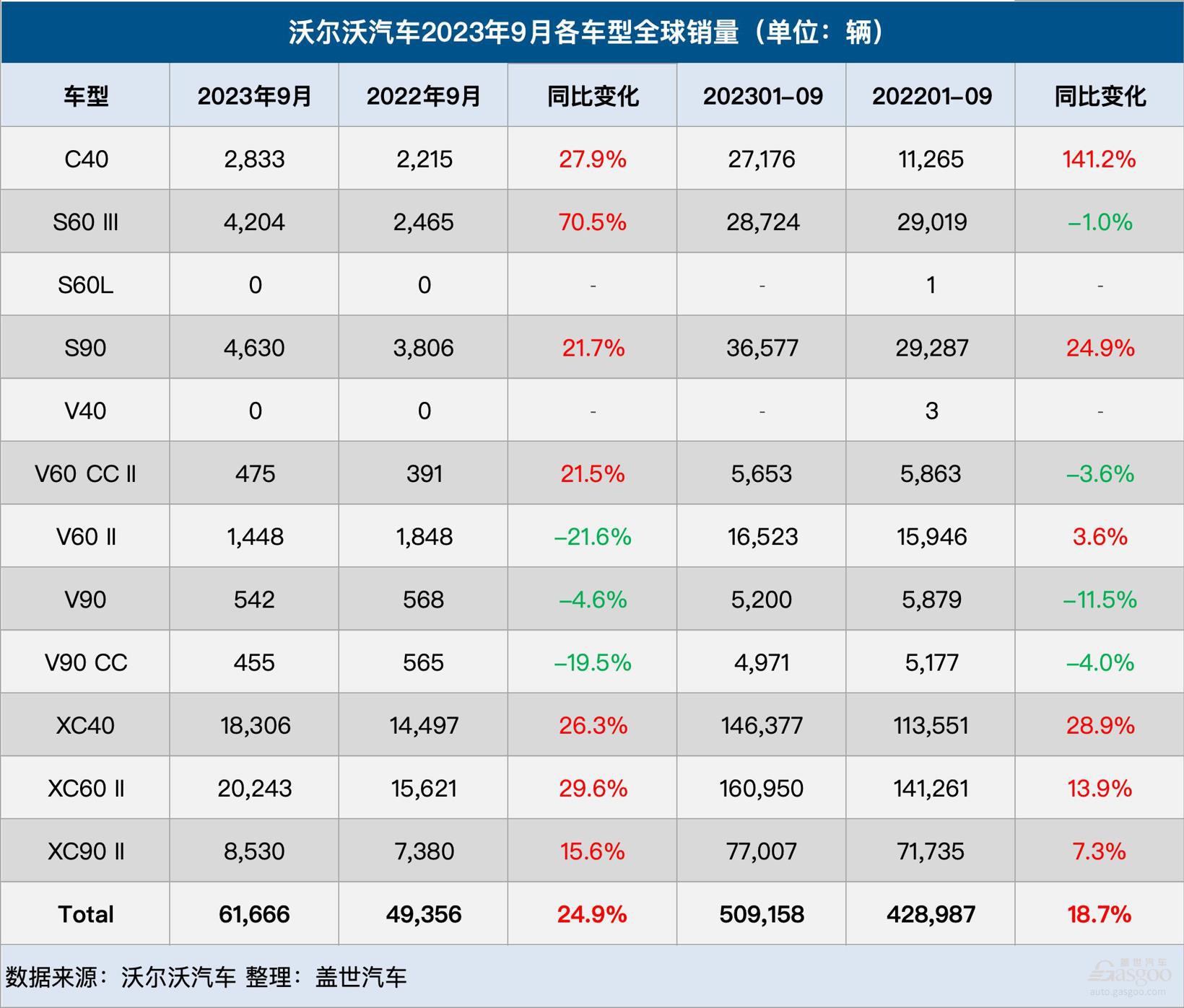 燃车速报讯 根据沃尔沃汽车官网发布的数据,9月份,得益于在欧洲、美国和中国的销量均实现了增长,沃尔沃汽车在全球的销量达到61,666辆,同比增长25%。2023年1月至9月,沃尔沃汽车在全球累计销售了509,158辆汽车,同比增长19%。