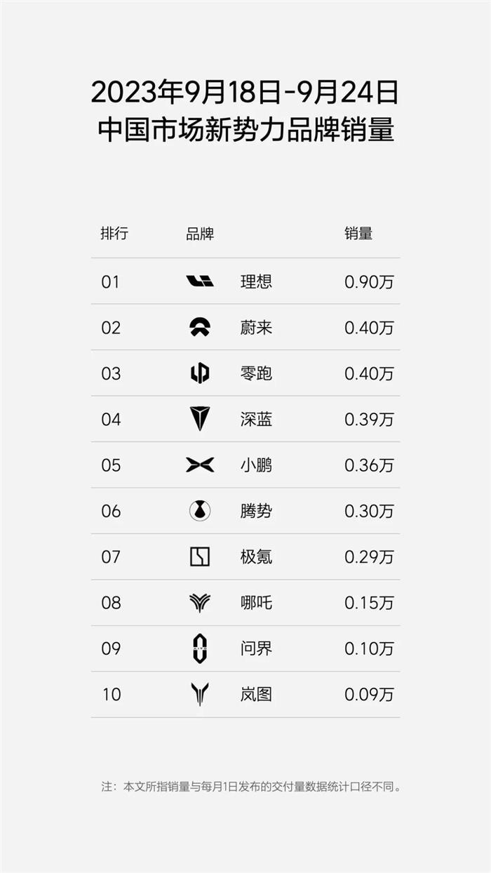 新势力方面,9.18日-9.24日,理想汽车的周销量达0.9万辆,稳居中国新势力品牌销量榜首。截至9月24日,本月销量已达2.92万辆,持续领跑新势力。