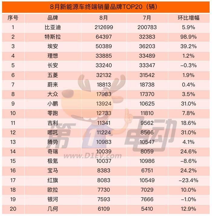 在经历了7月短暂的环比下滑后,比亚迪、特斯拉、埃安8月均出现上涨,其中特斯拉环比增长最大达98.9%,埃安环比增长39.2%。