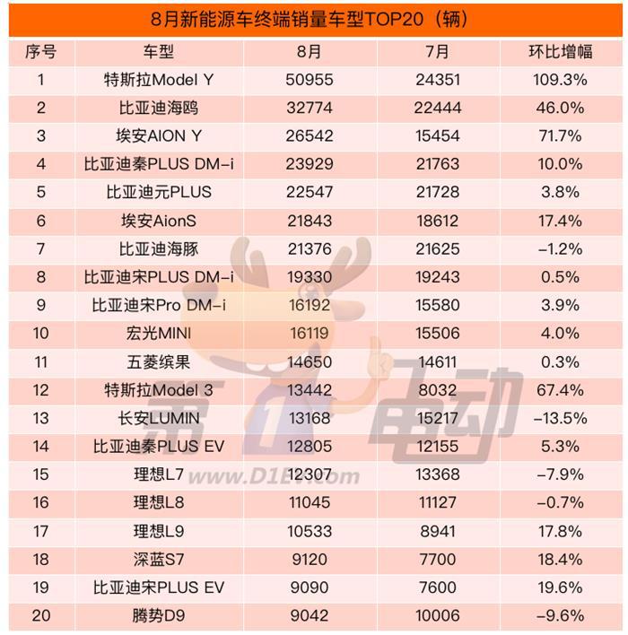 从车型TOP20来看,特斯拉Model Y环比大涨超一倍,仍然遥遥领先稳居冠军,比亚迪海鸥8月销量首次突破3万辆,位居第二,埃安AION Y环比大涨71.7%,取代秦PLUS DM-i跻身第三,而秦PLUS DM-i首次跌落前三。