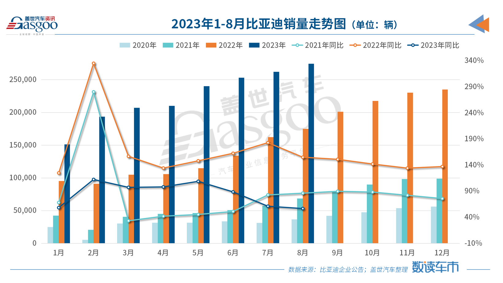 8月的月度销量冠军依旧毫无悬念,被再次刷新了月度销量纪录的比亚迪轻松拿下。8月比亚迪新车销量超27万辆,再创历史新高,同比增速较之此前一段时间虽然有所收窄,但依旧高达56.87%。