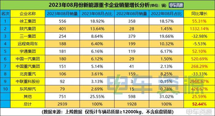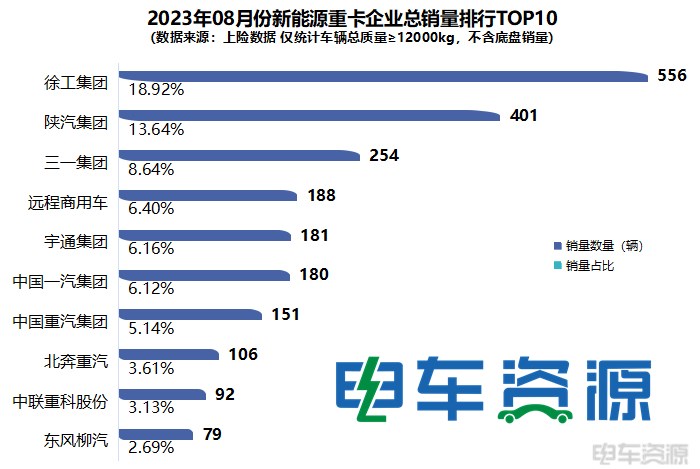 2023年8月,销量冠军企业是徐工集团,销售556辆,占比18.92%;销量亚军企业是陕汽集团,销售401辆,占比13.64%;销量季军企业是三一集团,销售254辆,占比8.64%。