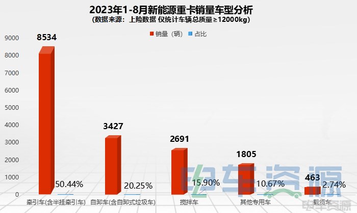 据电车资源统计(数据来源:上险数据,不含军车、出口车辆),2023年1-8月新能源重卡共销售16920辆,同比增长24.66%,其中8月份新能源重卡共销售2939辆,同比增长52.44%,环比增长22.46%,创今年月销量新高。销量延续了增长趋势,预期销量将持续增长。【按GB/T 15089--2001《机动车辆和挂车分类》标准,以N3为车型分类标准,符合国家工信部新能源汽车规定,本文新能源重卡仅指整车总质量≥12000kg的纯电动重卡、燃料电池重卡、插电式混合动力(含增程式)重卡车辆,包含牵引车(含半挂牵引车)、自卸车(含自卸式垃圾车)、载货车、搅拌车、专用车(环卫类与工程类等)等,不包含底盘、军车、出口车辆】
