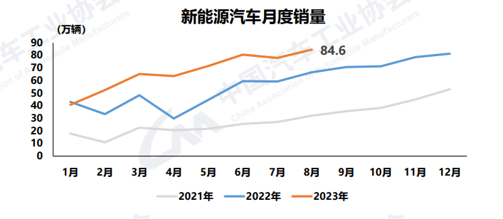 数据显示,8月,新能源汽车产销分别完成84.3万辆和84.6万辆,环比分别增长4.7%和8.5%,同比分别增长22%和27%,市场占有率达到32.8%。
