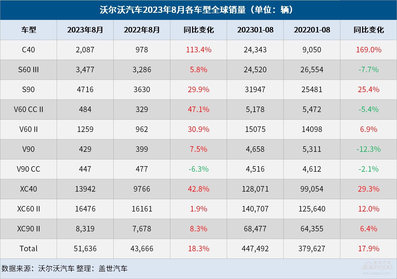 燃车速报讯 根据沃尔沃汽车9月4日发布的新闻稿,随着在欧美市场的销量大幅增长,沃尔沃汽车8月份在全球的销量同比增长18%,达到51,636辆。1月至8月,沃尔沃汽车共售出了447,492辆汽车,同比增长18%。