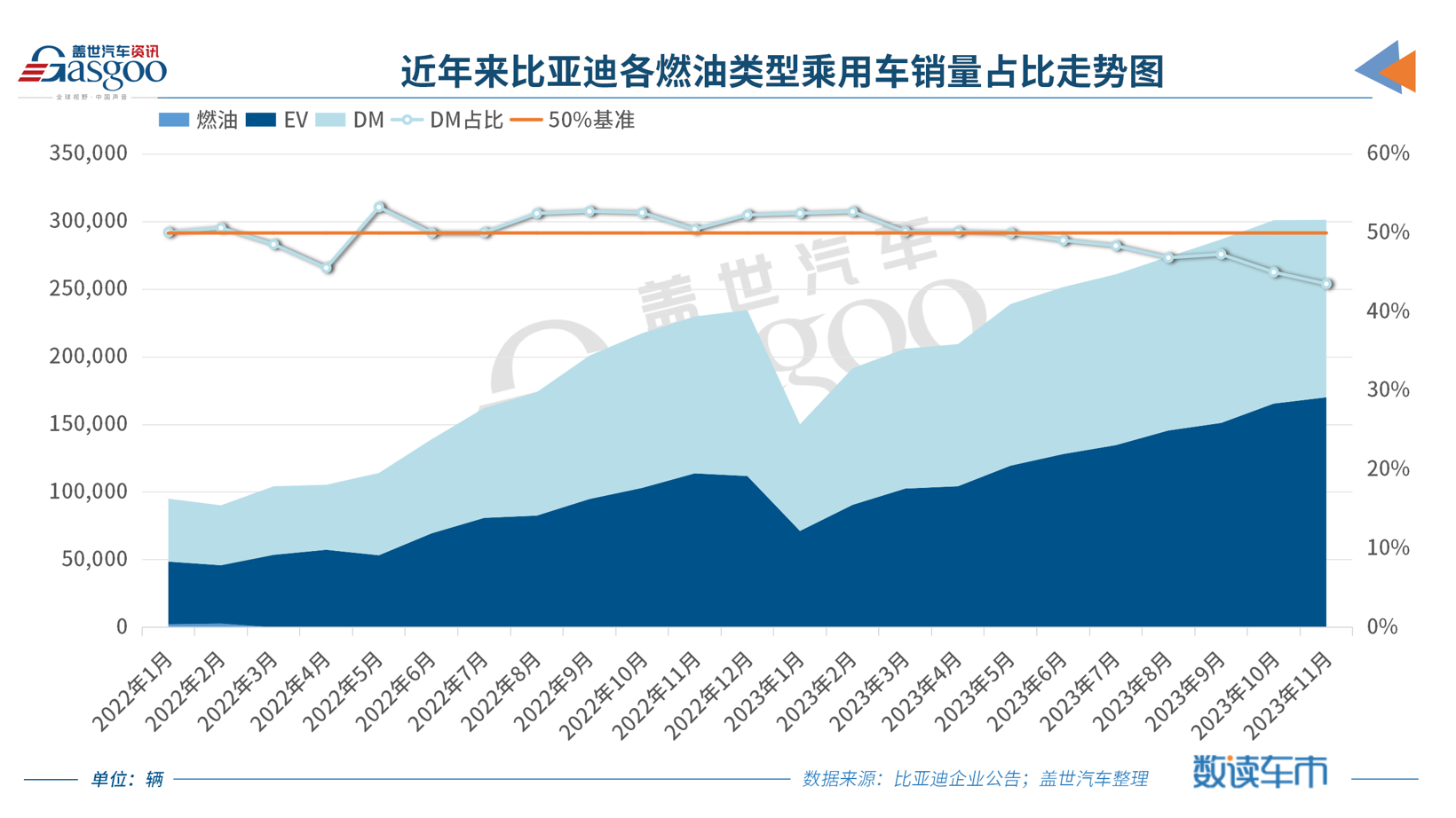 但仍需关注到,11月比亚迪DM混合动力车型比重持续收窄, 是自2021年6月以来首次跌破44%。