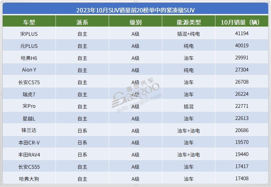 虽然此前行业内一直都在讨论所谓汽车消费升级的话题,但很显然,紧凑级家用车,依旧是国内汽车消费的主体。10月国内SUV销量前20榜单中,有13款都是A级SUV,这其中,自主车型更是占尽优势,除3款日系车型外,剩余10款车型都是自主产品。细分市场上的销量冠亚军,是比亚迪旗下的两款新能源产品:宋PLUS和元PLUS,两款车的月销量都在4万辆以上。