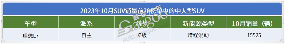 曾经的中大型SUV市场,是豪华品牌之间的“战场”,但随着近两年自主中高端新能源SUV车型井喷之势的到来,中大型SUV市场已经逐步转变成了自主新能源SUV的主战场。10月进入到SUV销量前20的产品虽然只有理想L7一款,但其实理想L8、问界M7等产品的表现也不错,月销量都在万辆以上。