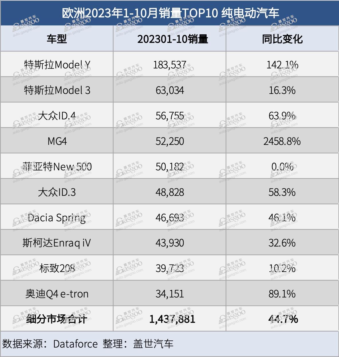 电动汽车依然是比较热门的板块。截至10月,特斯拉Model Y、大众ID.4和MG4的大幅增长推动了欧洲整体纯电动汽车的销量增长近45%,达到1,437,881辆。