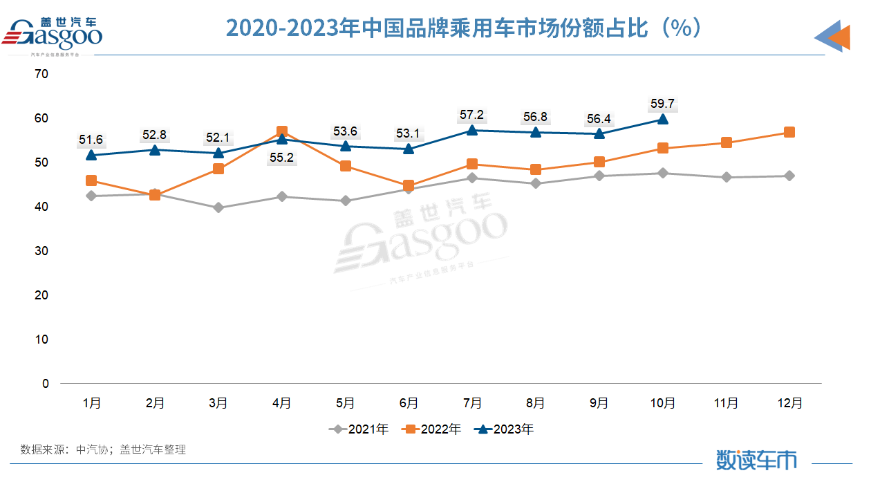 分品牌来看,在新能源汽车领域占据领先优势的中国品牌乘用车,在10月共销售148.5万辆,环比增长5.9%,同比增长25.1%,占乘用车销售总量的59.7%,占有率比上年同期提升6.6个百分点。