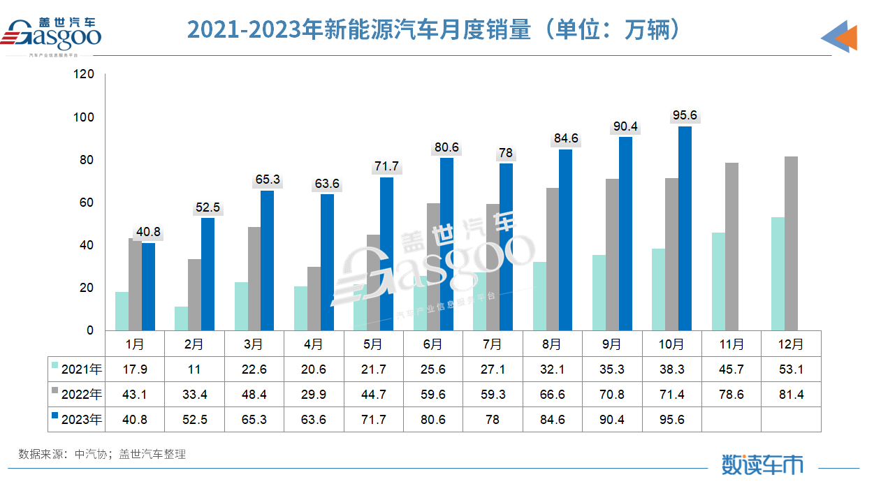 数据显示,10月,我国新能源汽车产销分别达到98.9万辆和95.6万辆,环比分别增长12.5%和5.7%,同比分别增长29.2%和33.5%,市场占有率达到33.5%,连续六个月占比超30%。