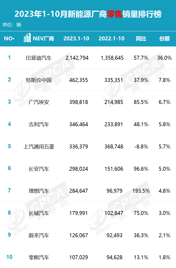 2023年1-10月,新能源汽车零售销量前十厂商零售销量合计468.26万辆,市场份额合计78.7%。其中,比亚迪汽车零售销量最高达214.28万辆,市场份额36%。特斯拉中国、广汽埃安排名第二和第三,零售销量分别为46.24万辆、39.88万辆,市场份额分别为7.8%、6.7%。吉利汽车、上汽通用五菱、长安汽车、理想汽车、长城汽车、蔚来汽车、零跑汽车进入前十,依次排名第4-10名。