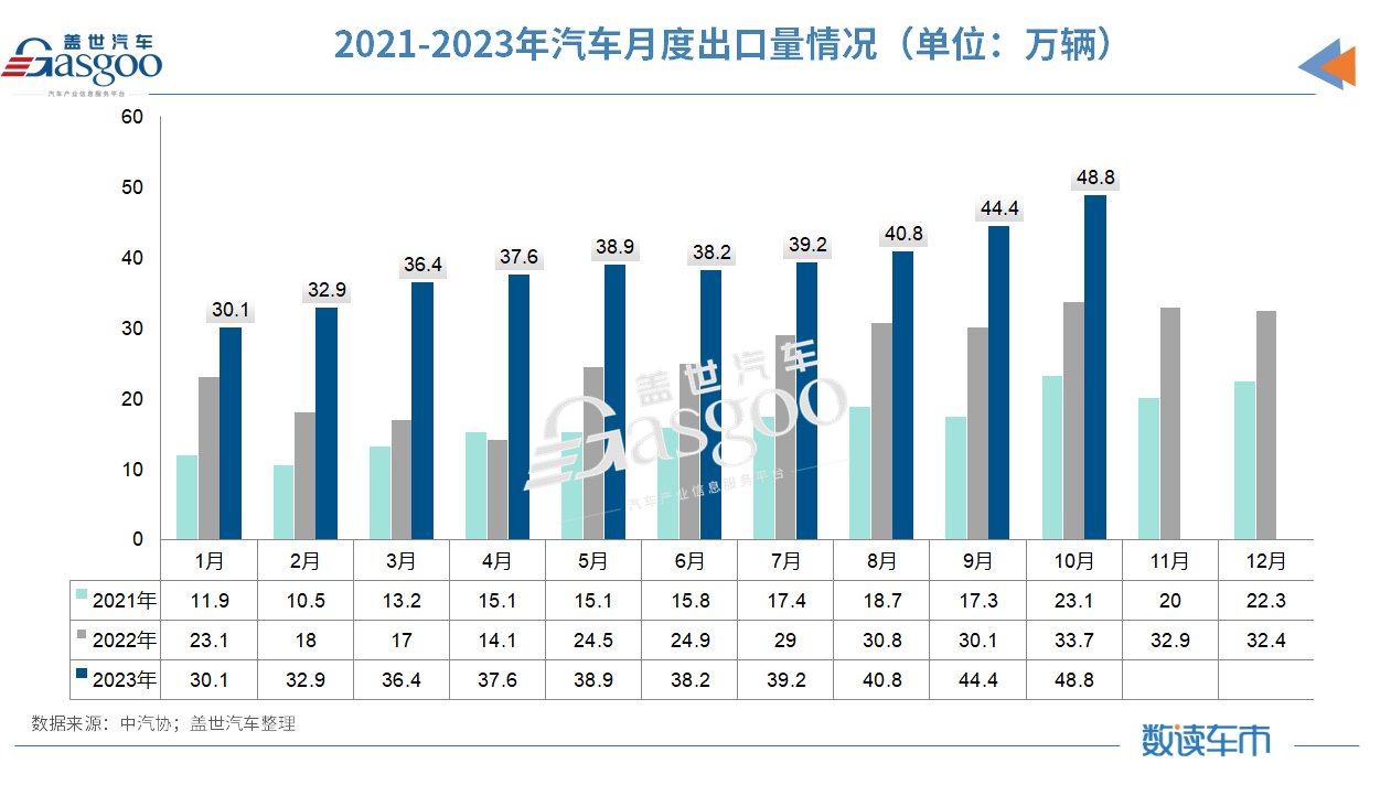 数据显示,10月,我国汽车出口48.8万辆,环比增长9.8%,同比增长44.2%。