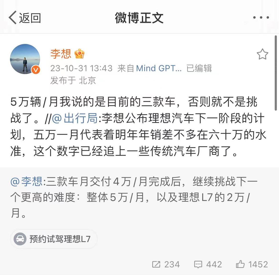 而不仅如此,对于11月,理想汽车董事长兼CEO李想已表示,继续挑战下一个更高的难度:整体5万/月,以及理想L7的2万/月。