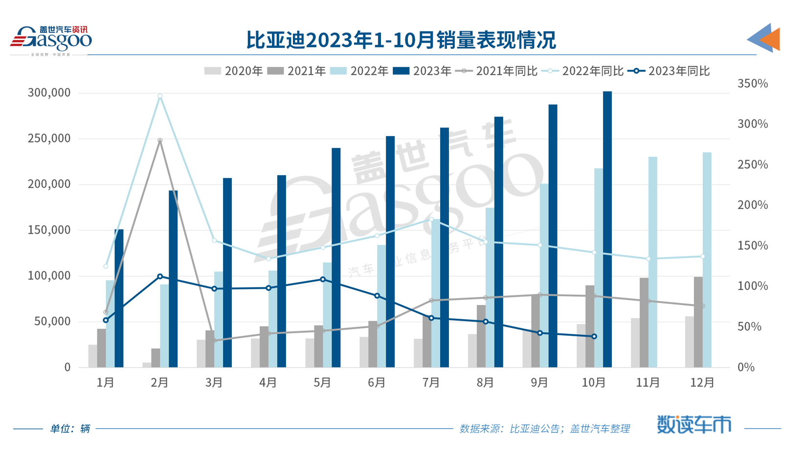 10月,比亚迪共销售新车301,833辆,同比增长38.57%,环比增长5%。前10月累计销量已达到2,381,471辆,同比增长近7成,依然吊打绝大多数车企。