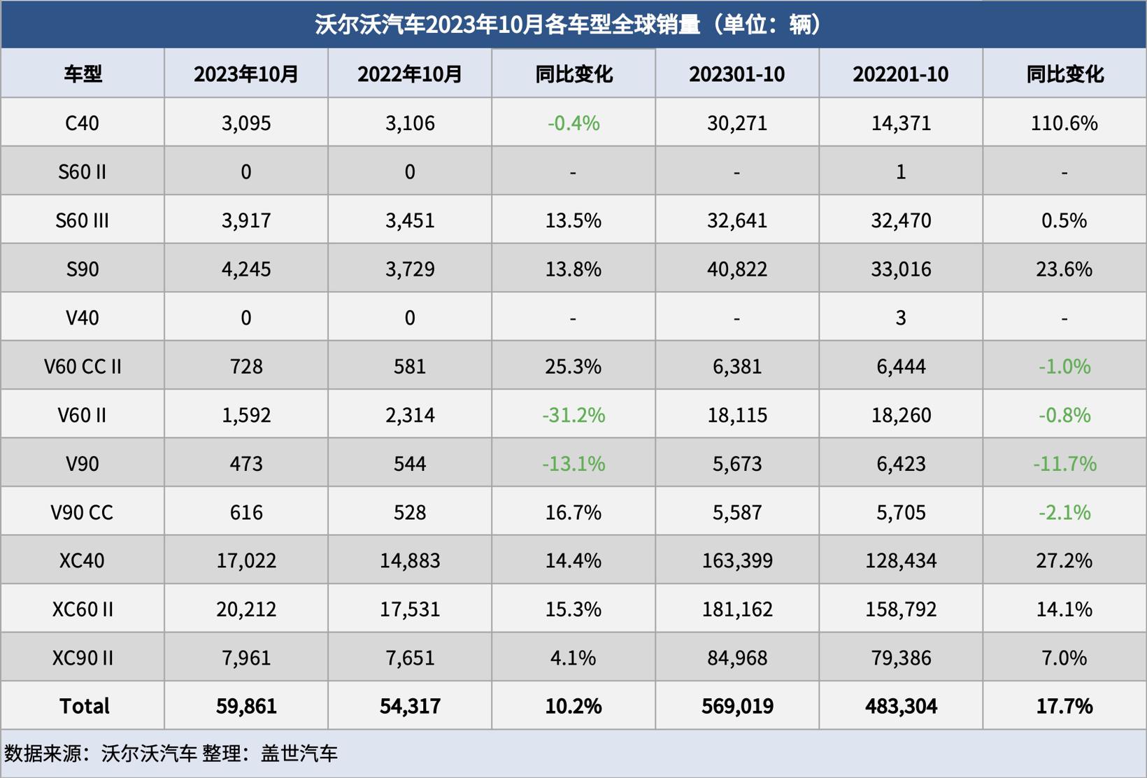 今年10月份,沃尔沃汽车的全球销量达到59,861辆,较去年同期增长10%,不过涨幅较9月份的25%有所收窄。今年前十个月,该公司在全球范围内售出了569,019辆新车,同比增幅为18%。