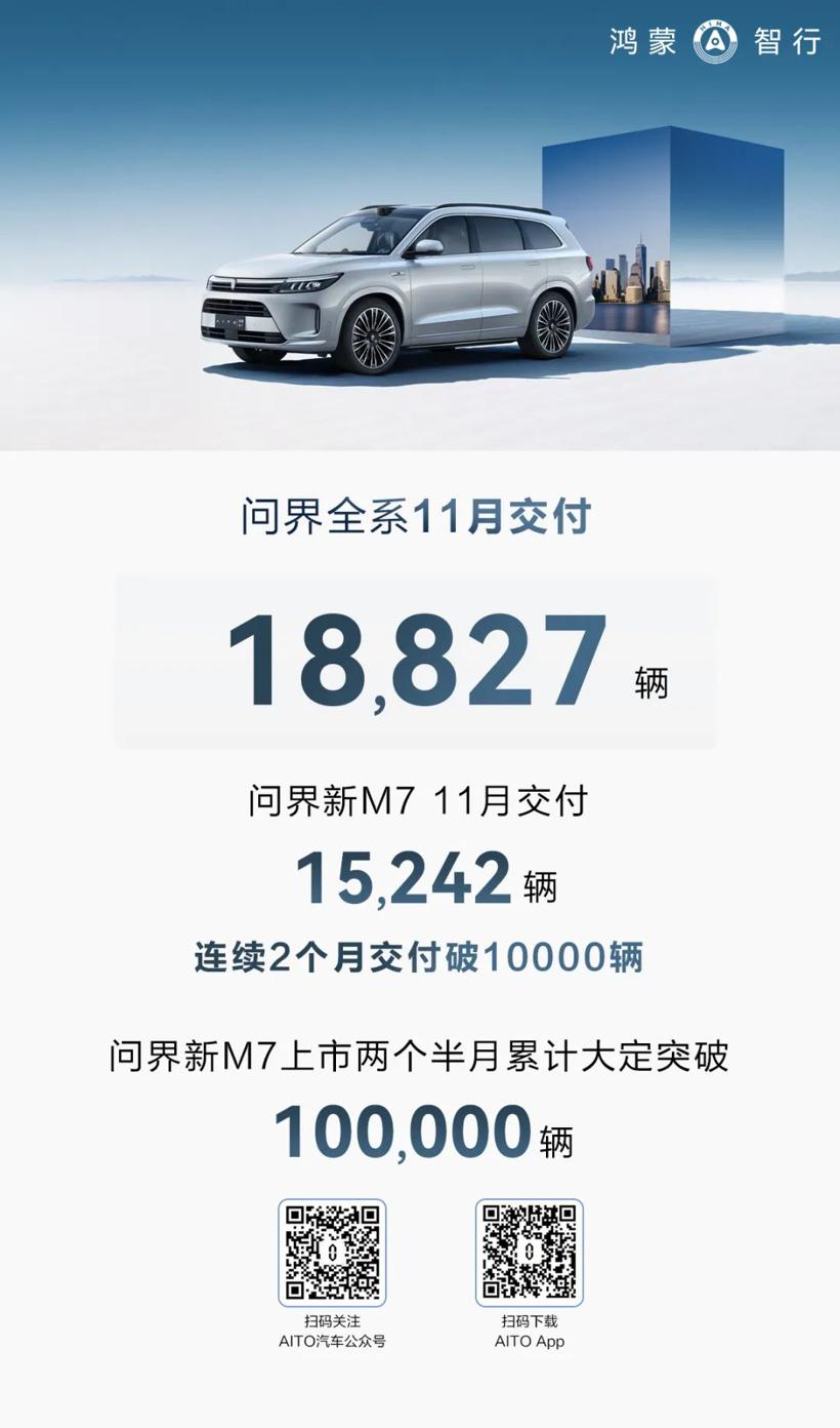 最惊喜表现当属问界。11月,鸿蒙智行旗下的AITO问界系列共交付新车18,827辆。其中,问界新M7交付新车15,242辆,连续两个月交付破1万辆,累计交付超27,000辆。