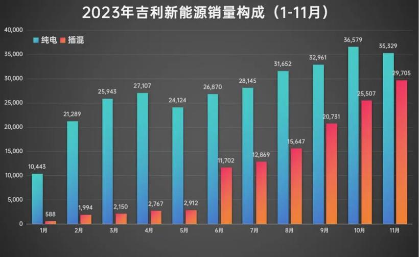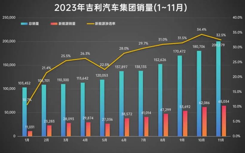 从吉利今年的销量变化可以看出,11 月突破 20 万只是开始,而在明年,随着新能源渗透率的逐渐走高,吉利在品牌布局、产品规划、出海战略上都会开辟更多的增长空间,明年注定会是吉利更精彩的一年。