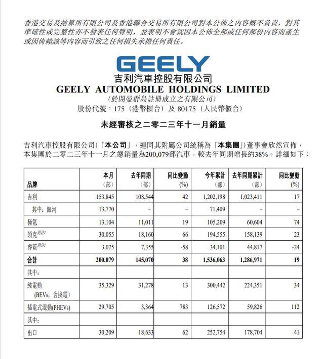 吉利汽车11月总销量达到200079辆,同比增幅为38%,今年累计销量达到153.6063万辆,同比增长19%,达成165万的年度销量基本没问题。具体来看吉利主品牌11月交付153845辆,同比增长42%;银河品牌11月交付13770辆,领克品牌11月交付30055辆,同比增长66%;睿蓝品牌11月交付3075辆,同比减少58%;极氪品牌11月交付13104辆,创造月度交付新高,环比增长0.2%,同比增长19%,今年极氪累计交付105209辆,同比增长74%,距离全年终端交付14万台的目标近在咫尺,目前极氪在售车型为极氪001、极氪X和极氪009车型,不过在不久前举办的广州车展上,极氪中型轿车007已经公布了22.99万元起的预售价。