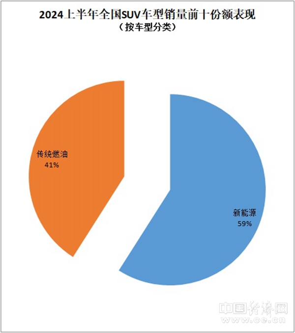 聚焦头部阵营表现,“电进油退”趋势明显。上半年,新能源车型包揽SUV销量前十榜单中的前五名,合计售出673128辆,占比59.03%;传统燃油车型只能“退守”后五名,合计售出467275辆,占比40.97%,市场份额差距达18.05%。