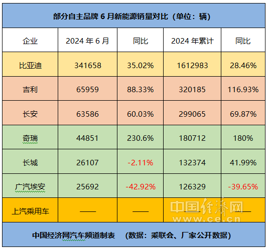 具体来看,6月,比亚迪、长安自主、奇瑞自主、吉利和长城的销量分别为341658辆、188910辆、184941辆、166085辆、98080辆,同比分别增长35.02%、1.97%、34.64%、24%、-6.55%;上半年的累计销量分别为1612983辆、1121346辆、1010355辆、955730辆、559669辆,同比分别增长28.46%、9.88%、45.57%、41%、7.79%。