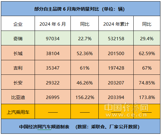 作为中国汽车品牌“出海”的先行者,奇瑞集团和上汽集团继续保持领先。其中,奇瑞集团在6月出口海外汽车97034辆,同比增长22.7%;今年上半年出口汽车532158辆,同比增长29.4%。