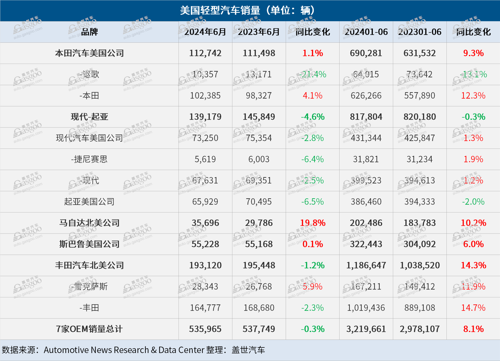 大众汽车第二季度销量同比激增31%,已连续三个季度增长。马自达报告称,第二季度的销量同比增长了7.3%。然而,MINI第二季度销量同比下降了22%。在其他豪华品牌中,宝马第二季度销量同比上升了3.7%,已连续八个季度增长;由于奥迪Q5和Q7的销量疲软,奥迪销量已连续两个季度下降。沃尔沃表示,受CDK中断对经销商的负面影响,其第二季度美国销量同比下降了9.6%至30,061辆。捷尼赛思第二季度交付量也同比下降了2.4%,至17,044辆。
