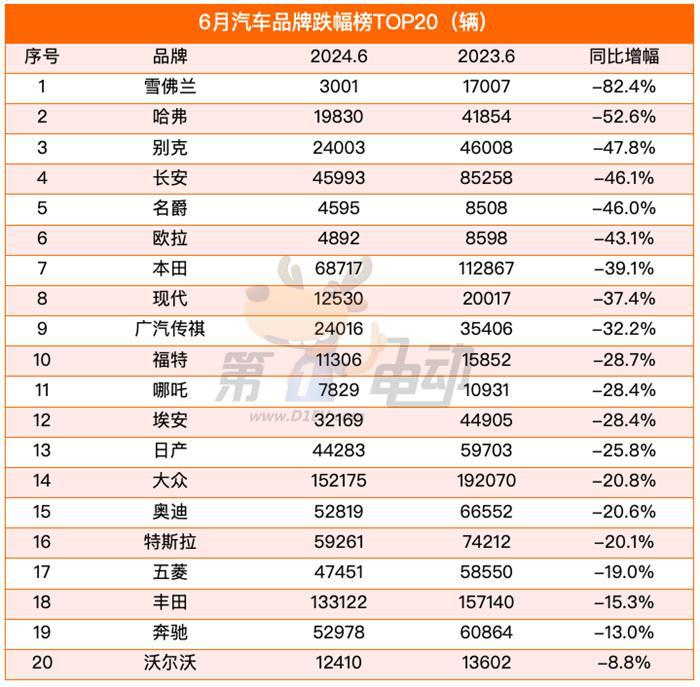 ▍6月跌幅榜:雪佛兰、哈弗腰斩,别克、长安、名爵、欧拉暴降超40%