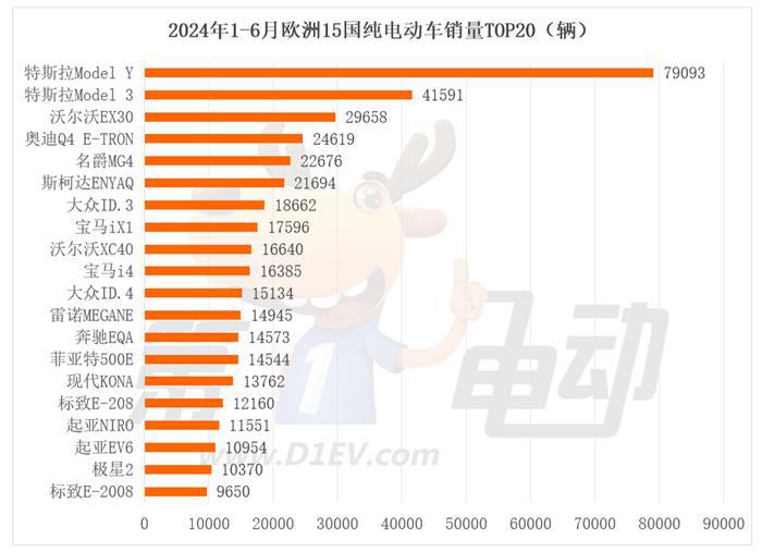 1-6月TOP20车型榜中,特斯拉Model Y、Model 3和沃尔沃EX30为欧洲市场最受欢迎的三款纯电动车。